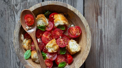 Panzanella salad is a tasty Italian dish that's traditionally made with dried bread, tomatoes, cucumber, red onion, basil, and a simple vinaigrette. The bread serves as more than just a crouton, as it's one of the core components of the dish. Since it absorbs moisture from the tomatoes and the dressing, using bread that's a little dry and stale is actually ideal as it helps prevent the dish from being too soggy.