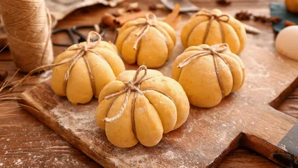 To get started, you'll just need to prepare and shape your cinnamon rolls as you normally would. Once you get to the point where you'd usually pop them in the oven, take a beat to create the pumpkin shape. You can do this by setting the roll in the center of your string, pulling each end up and over the bun, crossing at the center, and wrapping the ends back down the sides perpendicular to the first indentations (this will create four quadrants). From there, repeat the process so that you ultimately have eight equal sections, mimicking the shape of a pumpkin. Tie up your string so that it's secure but not too tight. Once you bake your buns, they'll puff up around the string and retain that iconic look.