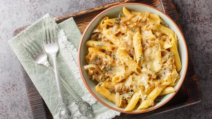 So what makes caramelized onions so perfect for pasta? Noodles are an ideal platform for bold flavors like caramelized onions; pasta won't compete with that signature savory taste, but it can also stand up to it. Additionally, caramelized onions can complement and contrast so many ingredients commonly found in pasta recipes, from robust meats to salty cheeses, veggies like mushrooms and eggplants, balsamic vinegar to tangy tomato sauce.