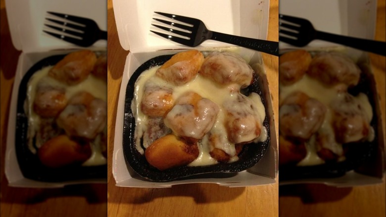 McDonald's Cinnamon Melts were sweet and spiced baked goods that were topped with melted cream cheese icing, and tasted very similar to a classic cinnamon roll. Unlike traditional rolls, however, a box of Cinnamelts came with bite-size pieces of doughy goodness baked together with a gooey cinnamon mixture, allowing customers to easily enjoy them with a fork or their fingers.