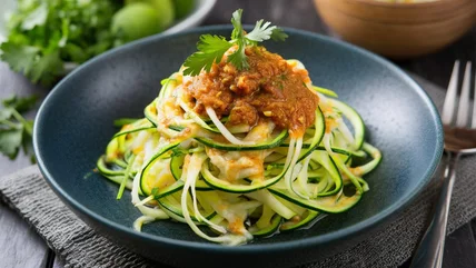 And when we say they're fast, they're fast. Zucchini noodles with fresh tomato sauce is a fresh meal that comes together in just about five minutes, with no cooking required. The most challenging part is making the spiralized zucchini noodles, and thanks to recipe developer Miriam Hahn, you'll learn a nifty trick for making them easier to make and eat.