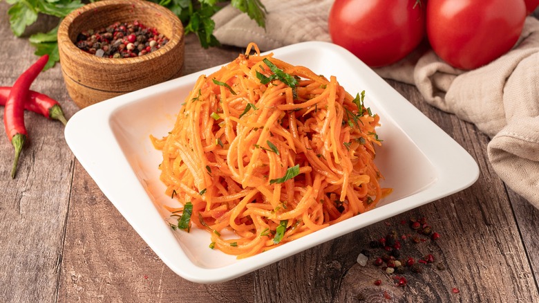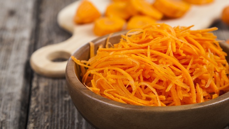 Shredding carrots — as opposed to dicing them — significantly boosts their ability to cling onto dressings and sauces. The secret lies in the increased surface area of a carrot shred. Think of it like prepping vegetables for cooking: When more of a veggie's surface area is exposed, more of that surface area will brown, thus providing more flavor. In the same way, exposing more of the carrot's surface area through shredding gives the dressing more room to hang out, making each bite more flavorful.
