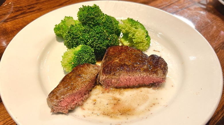 The presentation of the two steaks was markedly different, with the cheaper Renegade Sirloin coming out on top as a clear winner. This is because the plate was noticeably more neat than the LongHorn Porterhouse. Yes, it was smaller and round in shape, but the steak wasn't covered in grease and the side dish of broccoli seemed proportional to the cut of meat. In contrast, the more expensive steak was swimming in oil and the mashed potatoes were drowning it, making the plate seem messy. However, this dish was more of an oval shape and did have LongHorn Steakhouse branding on it, making it seem a touch fancier.