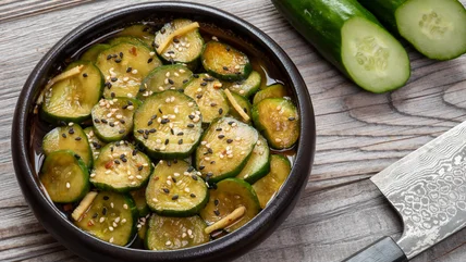 Pickles are a staple in Japanese cuisine and are traditionally served whenever rice is included in a meal (they're even a staple Japanese breakfast food). When made with cucumbers and soy sauce, these Japanese pickles are called shoyuzuke kyuri. There are several different styles of this tasty side dish, but most versions contain a simple mix of sushi vinegar, soy sauce, and sugar. The combination of flavors has the perfect amount of acidity and, of course, a nice touch of umami from the soy sauce. Some recipes involve cooking the pickles, while others skip the cooking and simply allow the cucumbers to steep in the soy sauce and vinegar mixture.