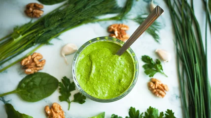 For vegans, this salad dressing is a welcome alternative to plain olive oil and vinegar for topping greens. The avocado makes it creamy, lemon juice brings the brightness, and basil, garlic, and chives give it zing. It's a tasty topping everyone can appreciate.