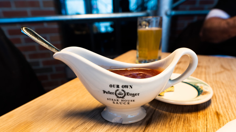 Horseradish has already established itself as the perfect ingredient for adding an extra zing to your pot roast, but its pungent, spicy flavor, which kicks in after being grated, adds another layer of flavor to this complex steak sauce. When vinegar is added, the chemical reactions that give horseradish its signature flavors are halted, keeping the spiciness and pungent flavor at the desired levels. This relationship between horseradish and vinegar allows for Peter Luger's steak sauce to maintain its truly unique flavor profile. If you don't think these ingredients meet your flavor and texture needs, consider using a jar of sweet jam to take your steak sauce to the next level.
