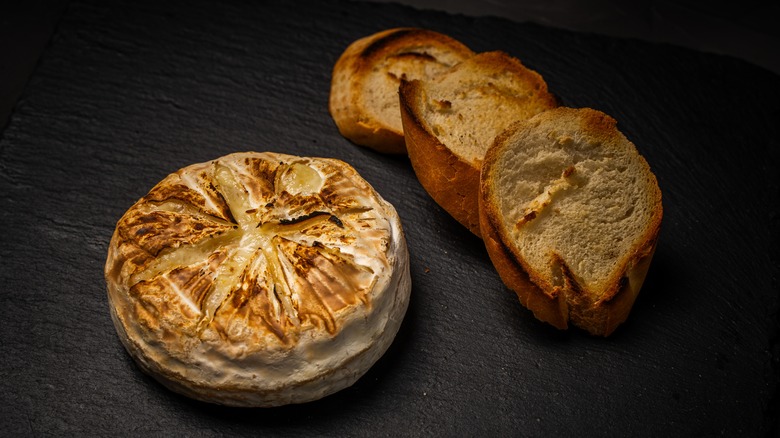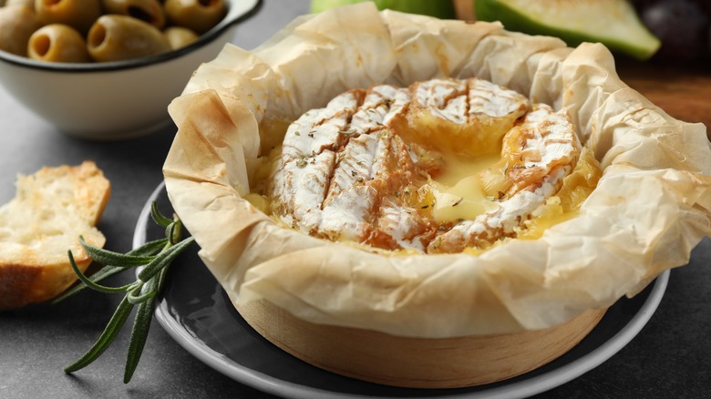 When brie is baked, its insides turn soft and almost astonishingly gooey, with its flavors blossoming and developing to become even more complex. Unlike other baked cheeses, all of this gooeyness is contained in brie's thick rind, which stops it from spilling all over your oven. There's one surefire way to make it spill everywhere, though — and that's cutting it from the side. People commonly cut into their baked brie as they would do if it was cool or at room temperature, trying to slice off a wedge (like they would a hot pizza). They're then surprised when it oozes like lava onto the plate, leaving you to try and scoop up the mess.