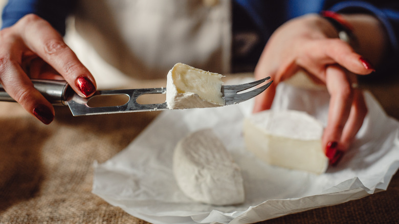 Brie is one of the classiest cheeses out there, and when you eat it, you wanna make sure you're doing it right. Unfortunately, that's easier said than done. Consuming this ancient cheese can be a metaphorical minefield of rules, etiquette, and preparation to ensure that you're getting the best bite possible. While all cheeses are best when eaten in a certain way, brie benefits enormously from being at a specific temperature and being sliced in a particular manner — and if you're getting this wrong, you're ending up with a substandard piece of what can be a very expensive cheese.