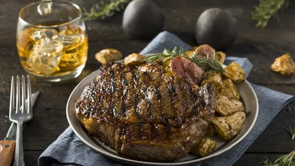 Whiskey is arguably the best spirit to pair with steak. It's robust enough to stand up to a hefty ingredient like beef, and whiskey's wood aging adds tannins similar to those found in red wine. Tannins are compounds that you experience as an astringent and bitter sensation in your mouth — think of a tea that's been steeped for too long, or a piece of intensely dark chocolate. These sensations and flavors can be unpleasant on their own, but tannins react with salt, fat, and protein in such a way that they work together to create a smooth and balanced mouthfeel.