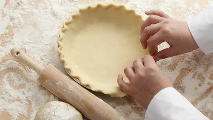 In its softened or melted state, butter will cause sticky dough that easily tears, resulting in a hard crust. Keeping all ingredients cool is one of the essential tips for making a pie crust from scratch. Even though it's shelf-stable, consider refrigerating your flour for a few minutes first. Other tips for keeping the temperature low include using ice water and refrigerating your mixing bowl and rolling pin. Whatever you do, just don't make the dough too cold, or it will come out overly crumbly.