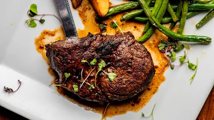Once everyone at your table is served, consider waiting a moment or two to let the meat rest so that the juices redistribute for the best flavor. When you're ready to begin eating, hold the knife in your dominant hand and your fork in the other. Using the fork stabilize the steak on your plate, and cut against the grain to maintain its texture. You only want to cut one bite at a time because the meat will cool too fast and lose its juices if you cut it all before eating, but there's an exception for children.