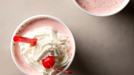 Milkshakes are topped with whipped cream and a cherry