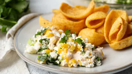 In traditional elote, a charred corn cob is loaded with sour cream or mayo, crumbly Cotija cheese, lime juice, and spices, and this recipe perfectly recreates that balance of flavors. As Shungu describes the dip, "The corn lends sweetness, it's a little tangy from the sour cream, the Cotija gives it a salty edge, and the jalapeños deliver heat." It also comes together in under half an hour, though the flavors will only deepen if it sits for longer, making it a perfect snack to serve at a party.
