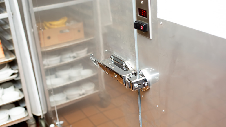 14. The walk-in refrigerator door is exposed or open