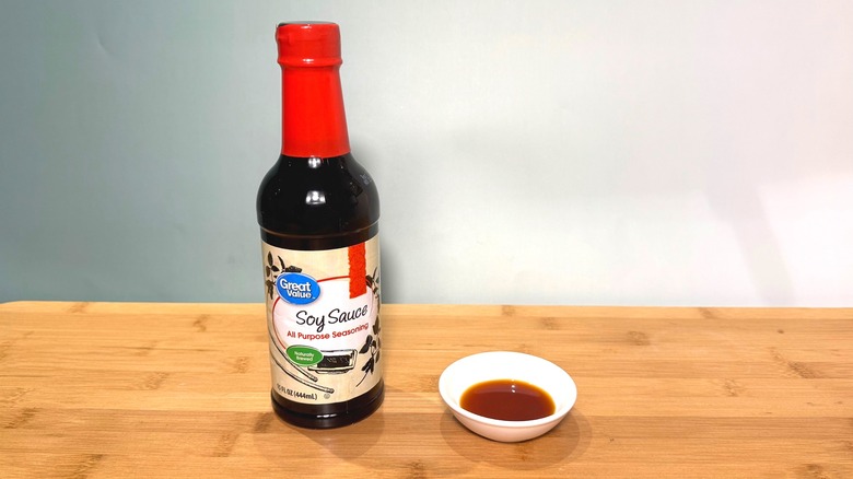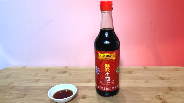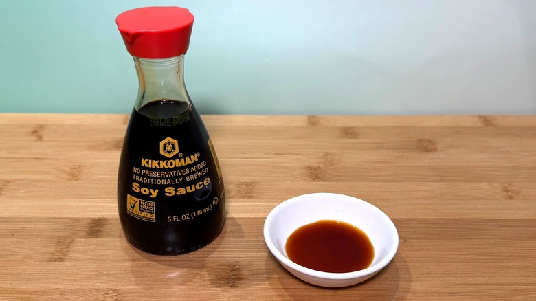 Here it is, one of the most recognizable bottles in the world — Kikkoman soy sauce. The dispenser's shape is so unique, it's actually been trademarked by the company. Whenever I set eyes on a curvy Kikkoman bottle, I'm taken back to childhood meals at our favorite Chinese restaurant, spinning dishes around the table on a lazy susan, my eyes locked on the plate of broccoli beef, hoping no one else would take the last bite before it got to me. Nostalgia can only get you so far, though, so how does Kikkoman actually hold up?