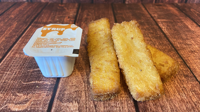 Burger King's french toast sticks are a few inches long and come with a side of maple syrup for dunking. The outside of the french toast sticks have a light crunchiness to them and the inside of the sticks are thin and kind of spongy. The texture of the outside is nice, but because they are mostly flat and the inside is so thin, the texture of these french toast sticks doesn't accurately replicate the real thing.