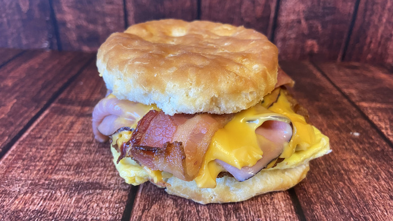 The fully loaded biscuit sandwich comes with egg, ham, bacon, sausage, and American cheese. Conceptually, this sandwich makes a lot of sense. People love ham, bacon, and breakfast sausage, so loading up a biscuit with all three meats seems like a good idea. But the reality is that featuring three different processed breakfast meats makes this sandwich way too salty. Ham, bacon, and sausage all tend to be packed with sodium. When all three of them combine in this biscuit breakfast sandwich, I found the saltiness to be overpowering.