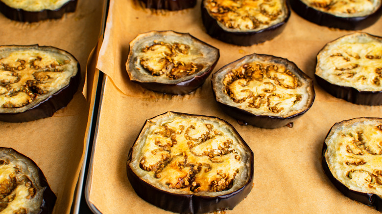 The Pasta Queen notes, "Blending the oils preserves olive oil's flavor and health benefits while vegetable oil raises the smoke point for frying." This means your eggplant is going to get nice and crispy without burning. How do you know when your oil is ready? Munno places the handle of a wooden spoon in the pot of oil and if it starts to bubble at the base, the oil is hot enough to start frying up those slices of eggplant. You can tell the eggplant pieces are done when they have a golden brown finish.