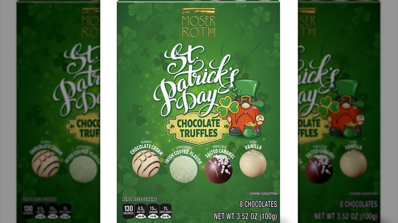 While some people look for a pot of gold at the end of the rainbow, a pot of chocolates would be just as good. And, with Moser Roth St. Patrick's Day Truffles coming to Aldi shelves starting February 26, 2025, for just $3.29 for a box of eight chocolates. As with some of their beloved chocolate bars, Storck is the German brand behind these treats. The best part about these chocolates is that they come with four flavors in a pack — vanilla, salted caramel, chocolate cream, and a festive Irish coffee flavor.