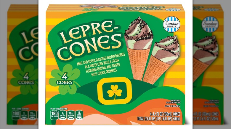 Even in cold weather, munching on an ice cream cone can still be a tasty treat. Aldi knows this all too well, and its Sundae Shoppe Mint Lepre-Cones are the perfect St. Patty's Day treat to finish off a meal. These mini cones appeared in 2023 as part of several Aldi ice cream St. Patrick's Day treats and are made of a sugar cone filled with mint and chocolate ice creams. The cone also comes with a cocoa coating inside and a chocolatey cookie crumble on top to really bring round out the treat. If you want to get your hands on one of these treats, you can pick up a four-pack of the cones starting February 26th, 2025 for just $3.99.