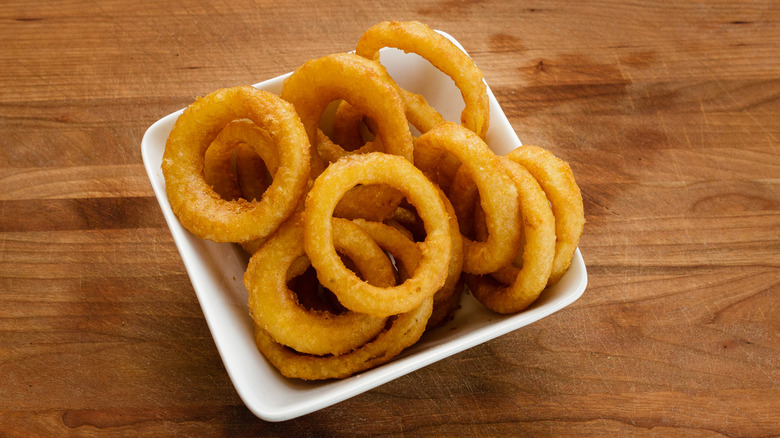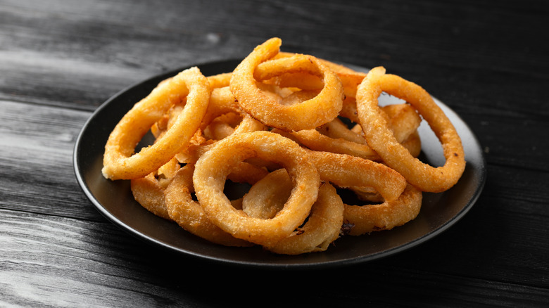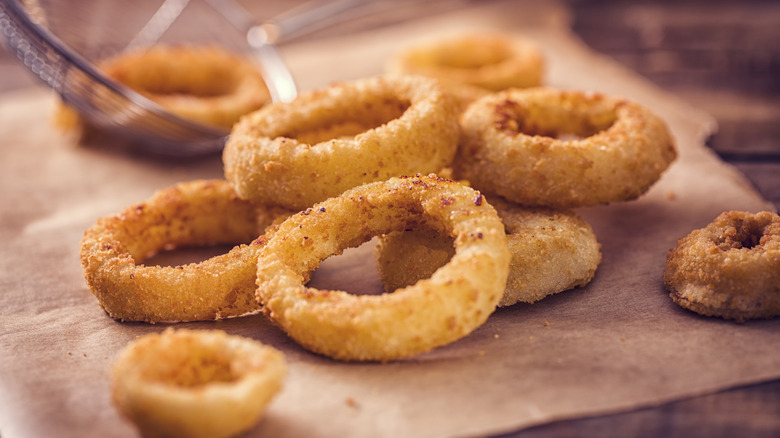 It's worth pointing out that if you're doing this, you're going to want to cook your onion rings in a deep fryer or by pan-frying them. This immediate heat is what you need for the batter to firm up properly, and while you can try to cook them in the oven or air fryer after battering them, you're more likely to end up with a soggy mess. Whip up a simple beer batter using an egg, some beer, and some flour, and then dip your rings in before plopping them straight in your hot oil. You don't need to worry about thawing them: They'll thaw and cook in the oil just fine. As a final bonus, you can also use this batter as a vehicle for additional flavor. Try mixing in your seasoning blend of choice before dipping your onion rings in. You'll thank us later.