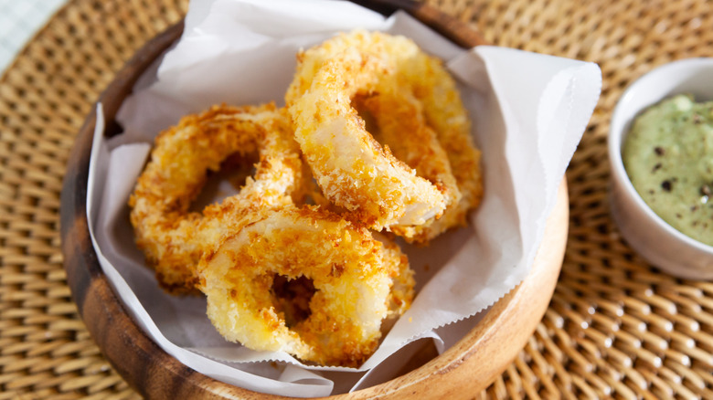 When air frying onion rings, though, it's important to avoid double-stacking them. The smaller size of air fryers can lead to folks piling up their onion rings in the basket, but this can stop the air inside the machine circulating properly around the food. This overall coverage is key to generating as much crispiness as possible, and you may instead find that your onion rings have some soggy patches due to the generation of steam around them. If you don't have enough room in your air fryer to cook all your onion rings at once, try cooking them in batches, and then popping the finished ones in a low oven to keep them warm while you finish up the others.