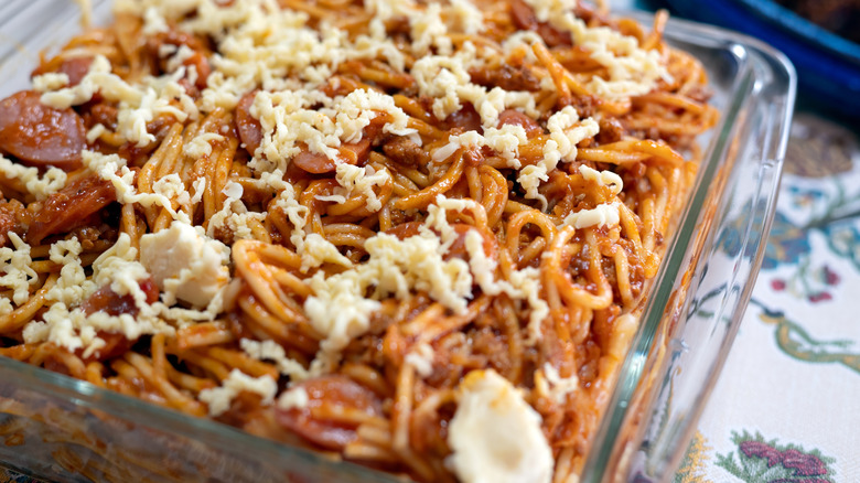 Filipino spaghetti also uses some form of meat — but it's different than you'd expect. Hot dogs or sliced sweet sausage called longanisa are often added to this dish for an extra burst of flavor. The hot dogs deliver a salty, meaty punch that perfectly complements the Filipino spaghetti's sweetness.