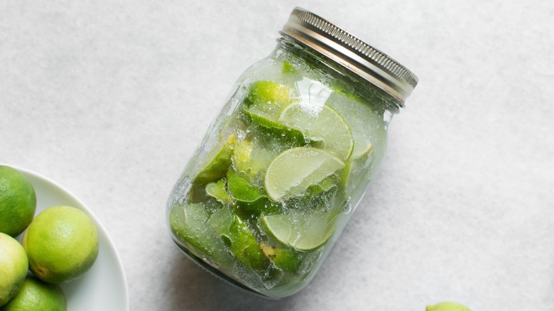 The recipe for preserved limes is so simple it only calls for two ingredients: salt and limes. Start with as many of these green fruits as you need to fill a jar. Rinse them, pat dry, and cut off the ends. Cut each fruit in an "x" formation. Next, you'll want to pack in as much salt as possible. Compress the limes into a jar so they release their juices. Seal the jar and let it sit at room temperature for at least 12 hours. Repeat the process twice daily until they are soft and completely submerged in their own juices, approximately 2-3 days. If there isn't enough juice after 3 days, cover the limes with fresh lime juice. Chill it for a month before using, leaving it preserved for up to 6 months.