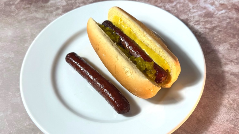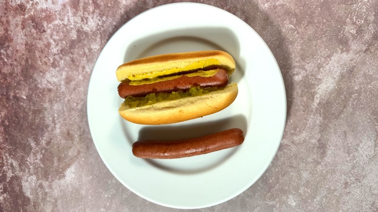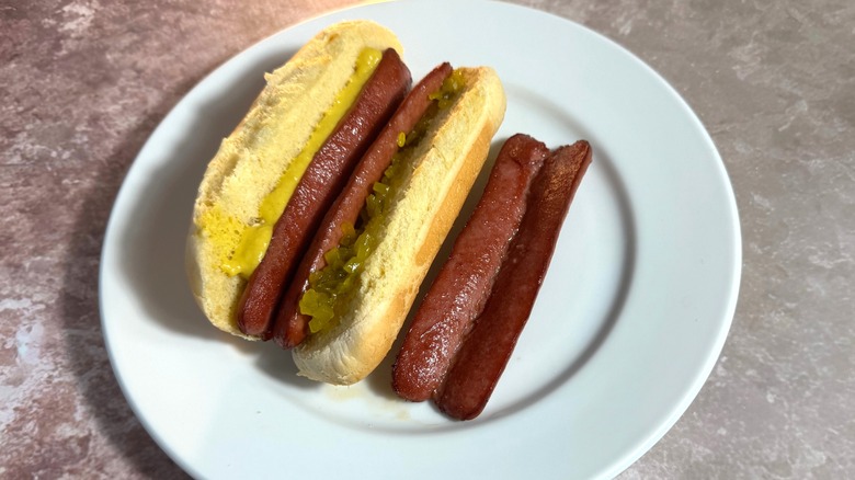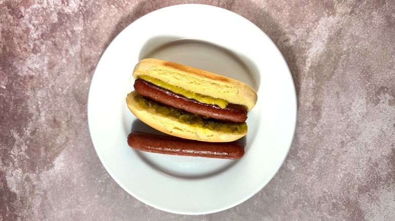 Especially when compared to the water-simmered dogs, these beer-bathed franks were absolutely popping with flavor. They still lacked the texture that comes from direct heat caramelization, but the taste was so enjoyable I barely missed the crunch or snap that some of the other methods produce. Porter beers have a roasted, malty flavor, and that element worked very well as a complement to the savory, salty taste of the dog itself. A mildly bitter bite from the beer added an extra dimension, too. With toppings, this dog shined even brighter, as the deep flavor contrasted with the bright tang from the mustard and relish. The next time you're planning on simmering some hot dogs, grab a beer or two from your fridge — just make sure you have enough to drink, too.