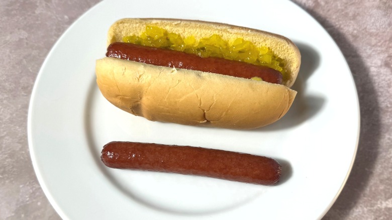 There are certainly merits to butterflying a hot dog, especially if cooking it on a flat-top or other griddling surface. If you're not familiar with the term, butterflying is a technique typically used with meats, including hot dogs, where you make a slice down the center but not all the way through, allowing the sides to splay out like an open book. The advantages of butterflying include quicker cooking time, a more evenly cooked piece of meat, and more surface area that can become caramelized, creating a crispier texture. Practically, with hot dogs, this also keeps the franks stable, stopping them from rolling around on the griddle's surface. Instead of having to rotate the dog as it cooks, you only have to flip it once.
