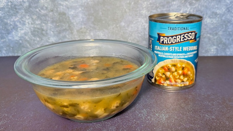 With Progresso's Italian roots, I had high expectations for their Italian-style wedding soup. Known as minestra maritata in its homeland, this style of soup varies in its composition by region, but the Italian-American version typically includes meatballs and bitter greens, as well as some kind of small pasta shape. Progresso's mini-meatballs are made from turkey and pork and are served swimming in chicken broth with carrots, spinach, and mezzanini rigati, a tiny, short tube-shaped pasta.