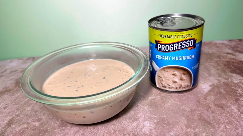 Part of the Vegetable Classics line, Progresso's creamy mushroom soup is simple. Simplicity is not an inherently bad thing, by any means, but it does make this soup a little bit boring to eat a full serving of. What this soup has going for it is the mushrooms, in both flavor and texture. Portobellos, which are among the most versatile types of mushrooms, are used here, chopped unevenly to give the soup some textural interest, and they have a good solid bite to them — they're not overcooked or mushy at all. Each drop of this soup is infused with a strong, earthy mushroom flavor.