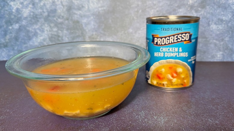 Even my second-least favorite Progresso soup is still pretty good, and that honor lies with the chicken & herb dumplings variety. The main elements of this soup are chicken broth and spätzle, a type of dumpling that's one of Germany's best-loved dishes. These dumplings are made with egg and flour have a rustic, short noodle-like shape and a chewy texture. Each part of this soup is fine — there are also diced carrots and celery, bits of chicken, and plenty of herbs to enhance the flavor. They just don't come together.