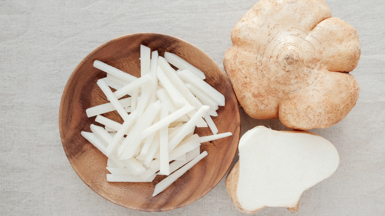 Despite the similarities in texture and uses, daikon radishes and jícama are very different. First, they come from different continents. Although daikon radishes and jícama are both grown underground, one has edible skin, while the other's peel is toxic. While both vegetables are crunchy and hydrating, their flavors — and appearance — are distinctly unalike. So, what's the difference between these two very unique vegetables?