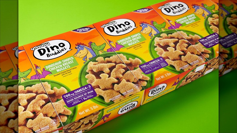 Over the years, Yummy Dino Buddies has added whole grain, meatless, gluten-free, and organic options to its product lineup. Alphabet shapes are available, too. The packaging comes with a variety of heating instructions, so it's possible to microwave the frozen chicken nuggets without making them soggy. And, while Yummy Dino Buddies are marketed toward kids, the young hearts at Daily Meal noted in a ranking of the best frozen chicken nuggets that the gluten-free selection is particularly terrific. The dino-shaped and fry-shaped options come out of the air fryer crispy (after an additional two minutes than the package instructions) and mouthwatering delicious when dipped in a mixture of honey and hot sauce. You can find them at your local stores, such as Hannaford, Kroger, Publix, Shoppers Food, Target, or Walmart.