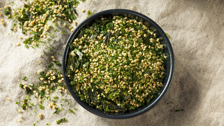 Furikake is a Japanese blend of dried seaweed, sesame seeds, and sometimes bonito (fish) flakes, salt, and sugar. It can be seasoned with soy sauce, mirin, wasabi, or other flavorings. Not only does it have umami appeal, but it is also a good source of calcium and other nutrients.
