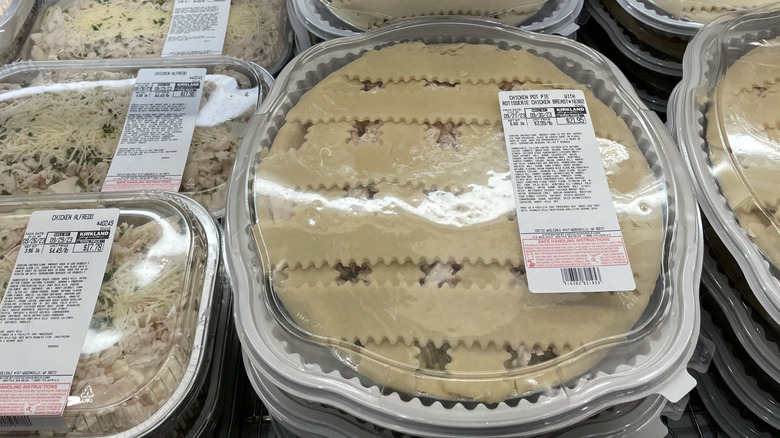 The Kirkland Signature chicken pot pie is a work of art and looks homemade, with a lattice pie crust on top. This pot pie is found in the deli section, so it isn't frozen, which oftentimes is a promising quality. Although the Kirkland Signature chicken pot pie still gets a lot of love from customers online, there's some curious shoppers who are noticing their favorite product has been on the decline.