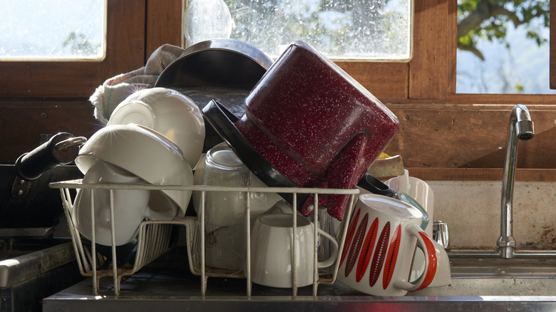 Well-worn dish drying racks can start to become a real eyesore. They stain, warp, and may crack, bend, or rust, depending on the material they're made of. Plus, they offer the perfect breeding ground for mold. All types of mold spores require water or moisture to multiply. Where does water have an opportunity to sit for long periods? Your dish drying rack — especially the water-catching tray beneath.