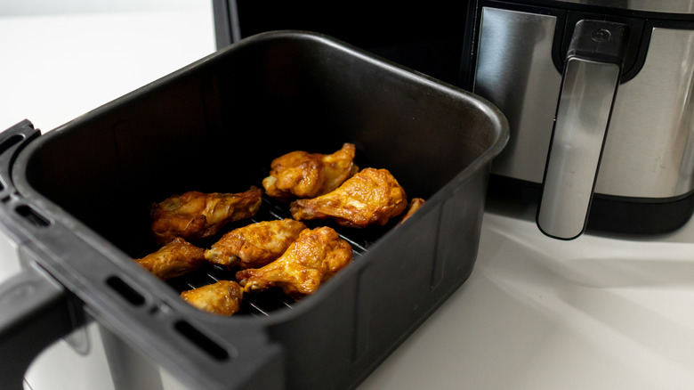 "If the wings were saucy to begin with, a light mist of oil before reheating can prevent them from burning or becoming overly dry," the chef adds. One of the most common air fryer questions concerns how exactly this device works — and the answer (the method of convection cooking) is exactly what makes it the perfect vessel for reheating those wings. Littley explains, "The rapid air circulation brings the crisp texture without drying out the wings."