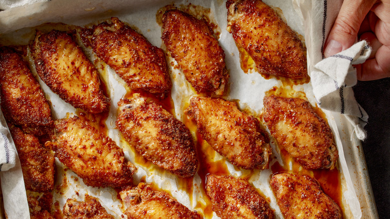 The chef instructs hungry home cooks to bake for 10 to 15 minutes, flipping the wings halfway through the baking time to ensure that all sides of the skin crisp up. If you're recoating the wings in sauce, Littley advises waiting to do so until after reheating "to avoid burning or caramelizing the sugars" in the sauce. Overall, Littley explains that "this method works well because it mimics the original cooking process, preventing the wings from drying out."
