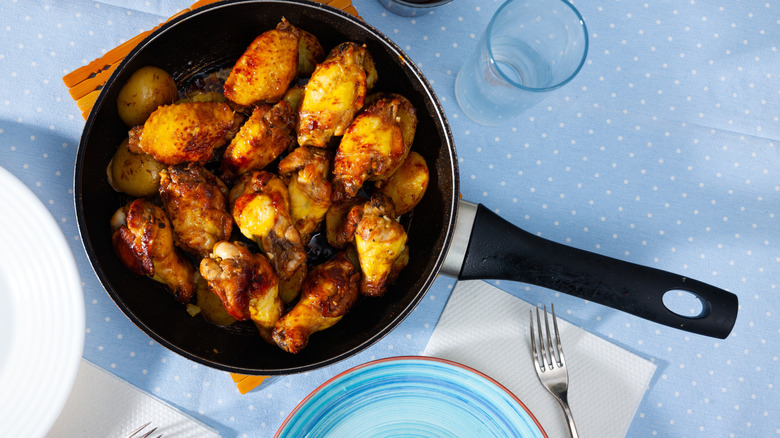 If the chicken seems to be drying out while on the stove, there is a simple fix for reheating wings without drying them out. Simply splash a bit of either water or chicken broth into the pan, then cover it with a lid to let the wings briefly steam. This will "[keep] the inside moist while crisping up the exterior." Talk about an expert tip.