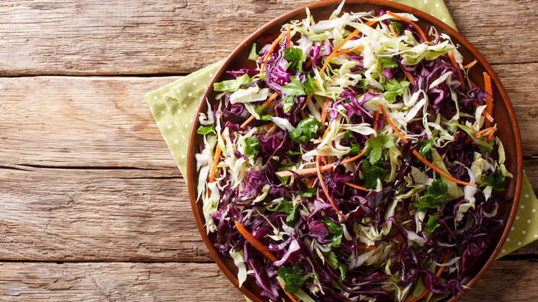As for any extra shredded cabbage, Cohen-Aviram says she keeps it in the refrigerator in a ziplock bag. "It gets moldy pretty quickly. As long as it's intact, it won't go moldy, but once you slice it, there's no way to keep it," she tells us. So make sure you plan on more than just coleslaw — whip up a cabbage and chili crisp stir fry the next day.