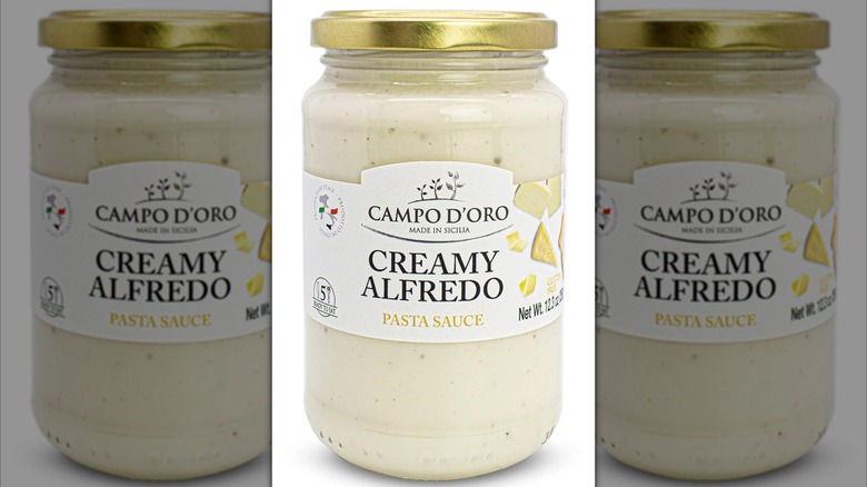 Now, if you can get past all that, then Campo D'Oro Creamy Alfredo Pasta Sauce may be worth a look. Compared to other jarred Alfredo sauces, this product's ingredients list is pleasingly recognizable — and while we don't love seeing modified corn starch and xanthan gum on there as thickeners, it's pretty far away from the wild list of processed names that plague some sauce labels. The issue is that we just can't quite get past that high saturated fat content, which pushes this sauce into unhealthy territory and makes it one you should probably skip.