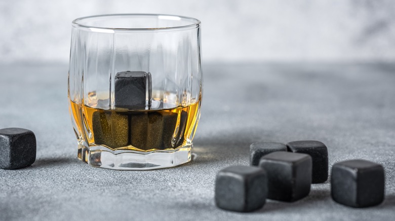 The solution is to always ask for your bourbon with just one or two large ice cubes. If you're in a good bar or restaurant, they'll likely do this already, so as not to water it down. Alternatively, your bourbon may be served with a whisky stone — a cube-shaped piece of stone that's chilled to a sub-zero temperature, to cool your drink without releasing any moisture into it. You can find whisky stones pretty easily online too, like these A&A Wonders Premium Whiskey Stones made from natural granite. If you prefer ice, large ice cube molds aren't hard to find either.