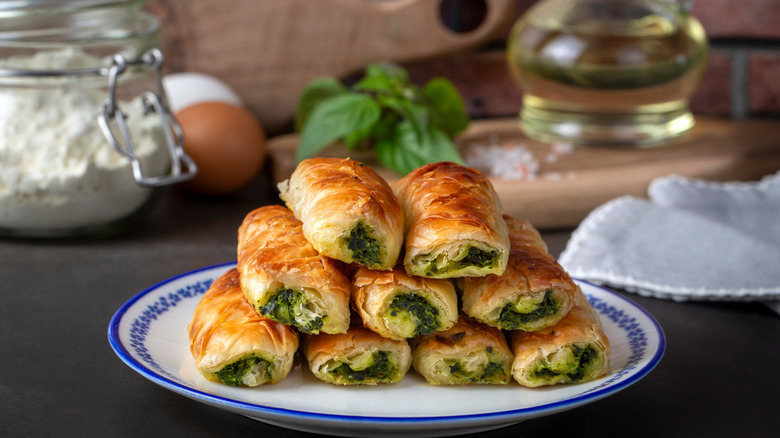 For instance, su böreği, or water börek, has a soft, lasagna-like texture, and sigara böreği, on the other hand, are crispy cheese rolls shaped into thin, cigar-like pieces and deep-fried. You also have kol böreği, or arm börek, which is coiled into a spiral. The filling also depends on the availability of ingredients — coastal areas typically have seafood fillings, while Anatolian regions often use spiced meats and potatoes. This works great if you're trying to cook up a Turkish breakfast, as you can come up with your own version, depending on what's most convenient for you.