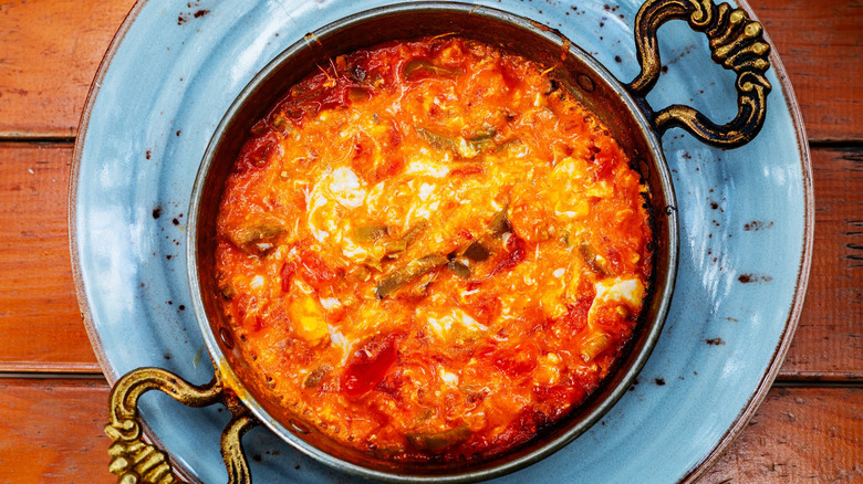 A sizzling pan of scrambled eggs made juicier and more flavorful with tomatoes and crisp green peppers, menemen is the quintessential Turkish breakfast comfort food and is often dubbed 'Turkish scrambled eggs' or 'Turkish omelet.' However, the people of Turkey have a distinct omelet of their own called kaygana, and menemen shares more similarities with Hungarian lecsó and Serbo-Croatian sataraš. It is perhaps closest to the North African shakshuka. But unlike shakshuka, where eggs are poached, menemen whips eggs into the vegetables.