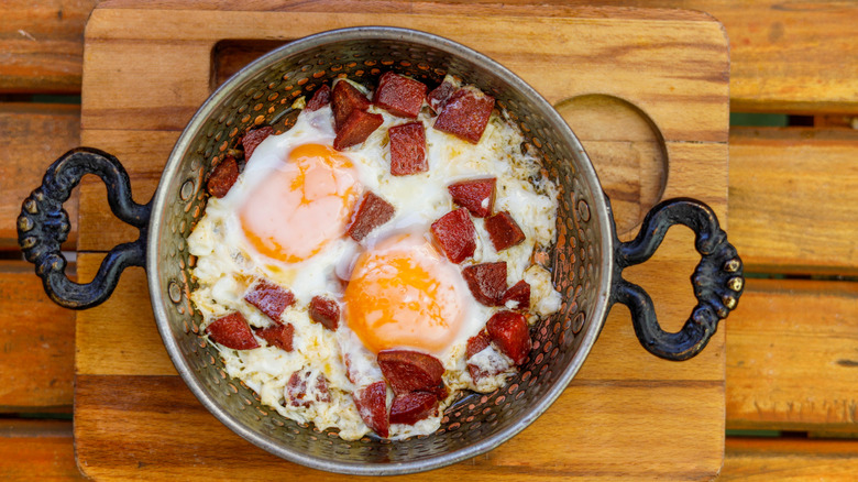 Sucuklu yumurta literally translates to 'eggs with sucuk' — a garlicky, spice-packed sausage usually made from ground beef and flavored with salt, paprika, and two cornerstones of Turkish cuisine: sumac and cumin. This sausage comes in a few standout varieties: kangal sucuk, a ring-shaped sausage; finger-like parmak sucuk; and büfe sucuk, a longer version of parmak sucuk. While sucuk is a staple in Turkish cuisine, you'll find versions across Eastern Europe, the Balkans, and the Middle East.