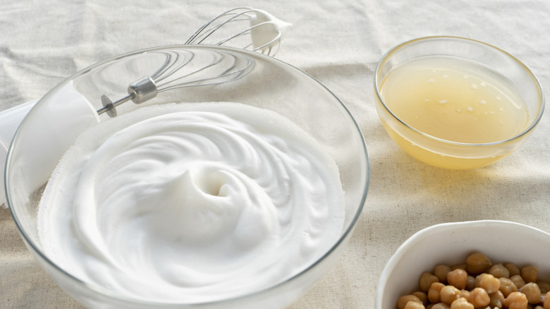 If you're working with aquafaba as an egg replacement, then, first things first, you'll need to "whip it lightly with a mixer until foamy," according to Nisha Vora. Once it's foamy, you can add it in with the other wet ingredients. She says, "This helps create structure and lift. When paired with an acidic ingredient like vegan buttermilk (plant milk + vinegar), you'll get even more rise."