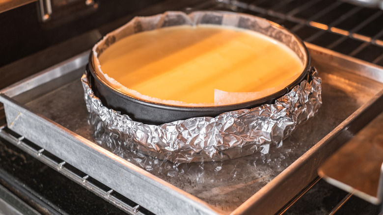 The chef explains, "The steam and humidity created by the water while the cheesecake is in the oven helps gently set the ingredients, letting them come together gradually which helps eliminate any cracks from forming. Many chefs swear by this method. When the timer on the cheesecake goes off, I like to open the oven a little bit to let the steam come out first, and then I take out the cake."