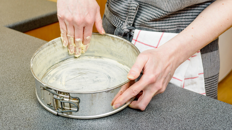 Greasing the pan is an important step in many recipes, but it plays an especially crucial part when it comes to making a crack-free cheesecake. Deden Putra says, "If you've ever watched baking shows featuring amateur chefs, one of the number one things they forget to do is spray or grease the pan before they start baking."